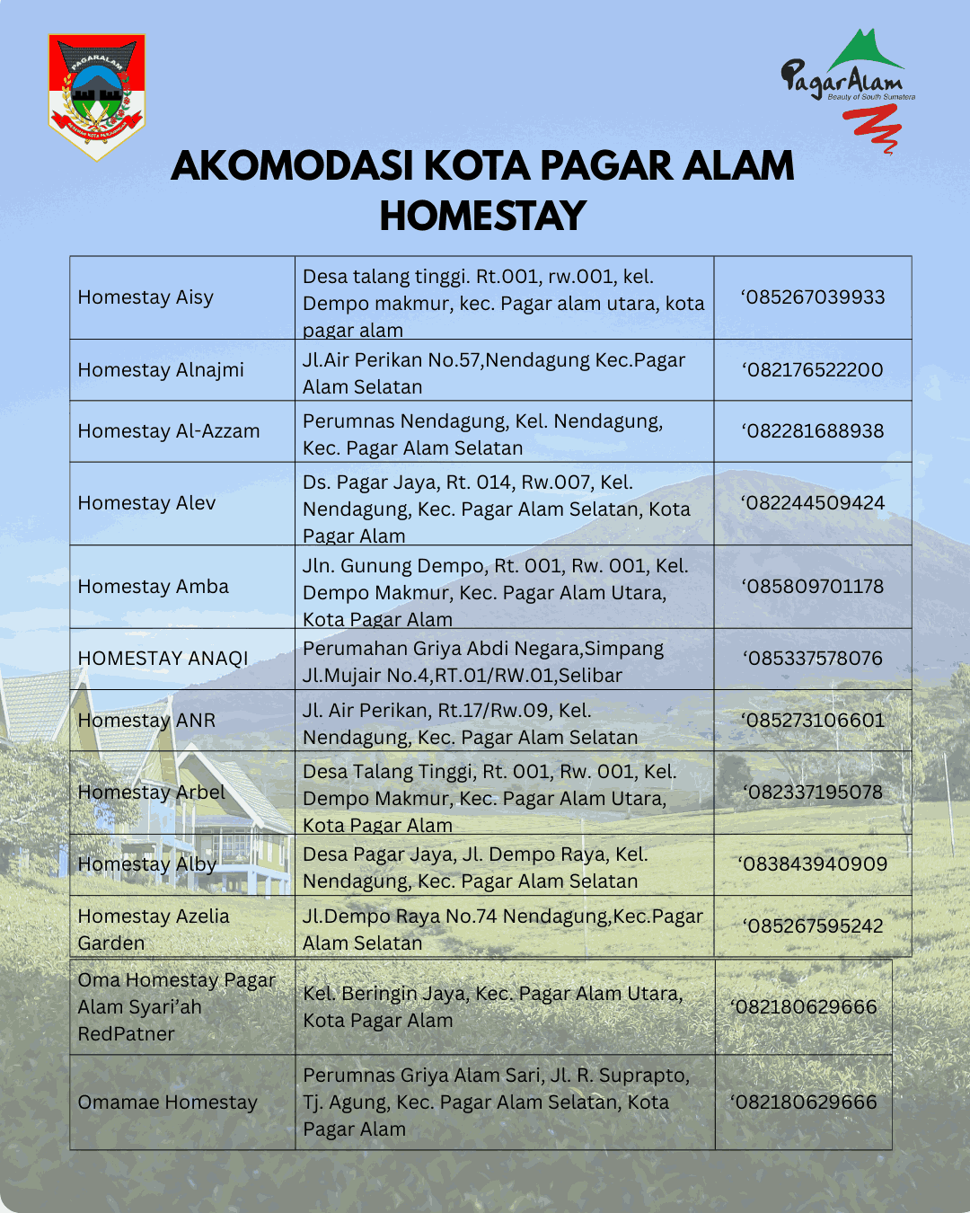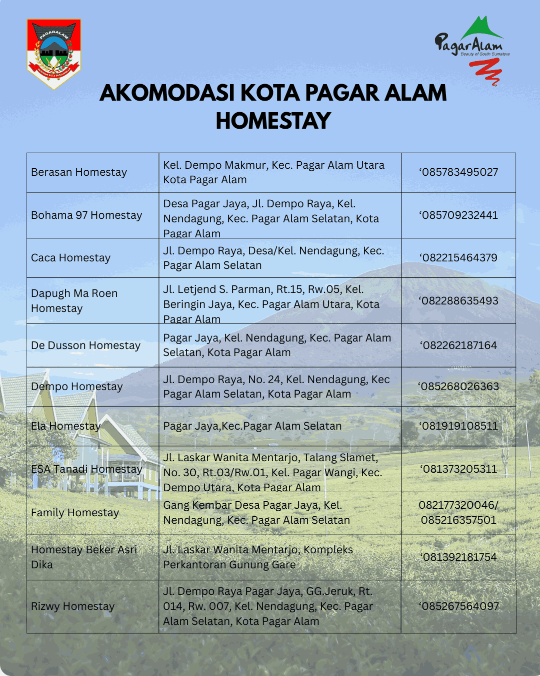 Kota Pagar Alam menjadi salah satu tujuan wisata unggulan di Sumatera Selatan. Dikenal dengan bentang alamnya yang memanjakan mata, kota berhawa sejuk ini dianugerahi dengan puluhan destinasi wisata, mulai dari Gunung Dempo, hamparan kebun teh yang menghijau, hingga cughup atau air terjun. Potensi alam ini terus dikembangkan dengan berbagai ide maupun inovasi baru untuk menghadirkan pengalaman wisata yang semakin menarik dan beragam.